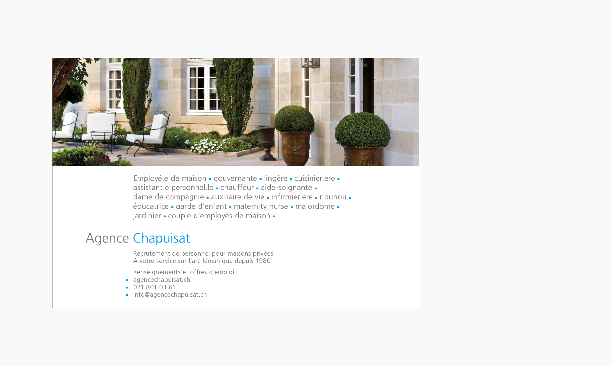 L’ Agence Chapuisat est active dans le domaine du recrutement de personnel de maisons privées en Suisse et à l’étranger depuis 1980. L’Agence Chapuisat a été fondée par Josiane Chapuisat et reprise par sa fille, Geneviève Chapuisat Pont.