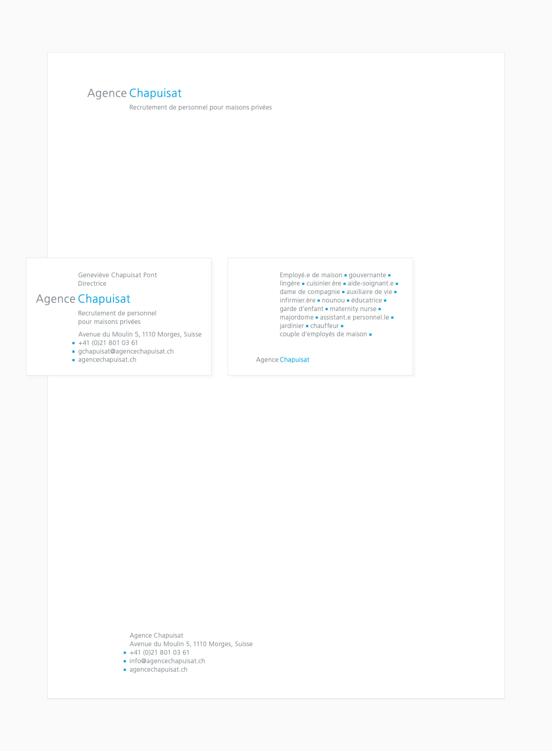 Mandaté par l’Agence Chapuisat, urs schmidt design a développé une identité visuelle qui exprime la spécificité et les valeurs de l’Agence Chapuisat, en mettant en évidence l’éthique de travail et la qualité des services qui ont fait sa réputation. L’identité visuelle apporte une solution graphique intemporelle déclinée sur tous les supports de communication de l’Agence Chapuisat.