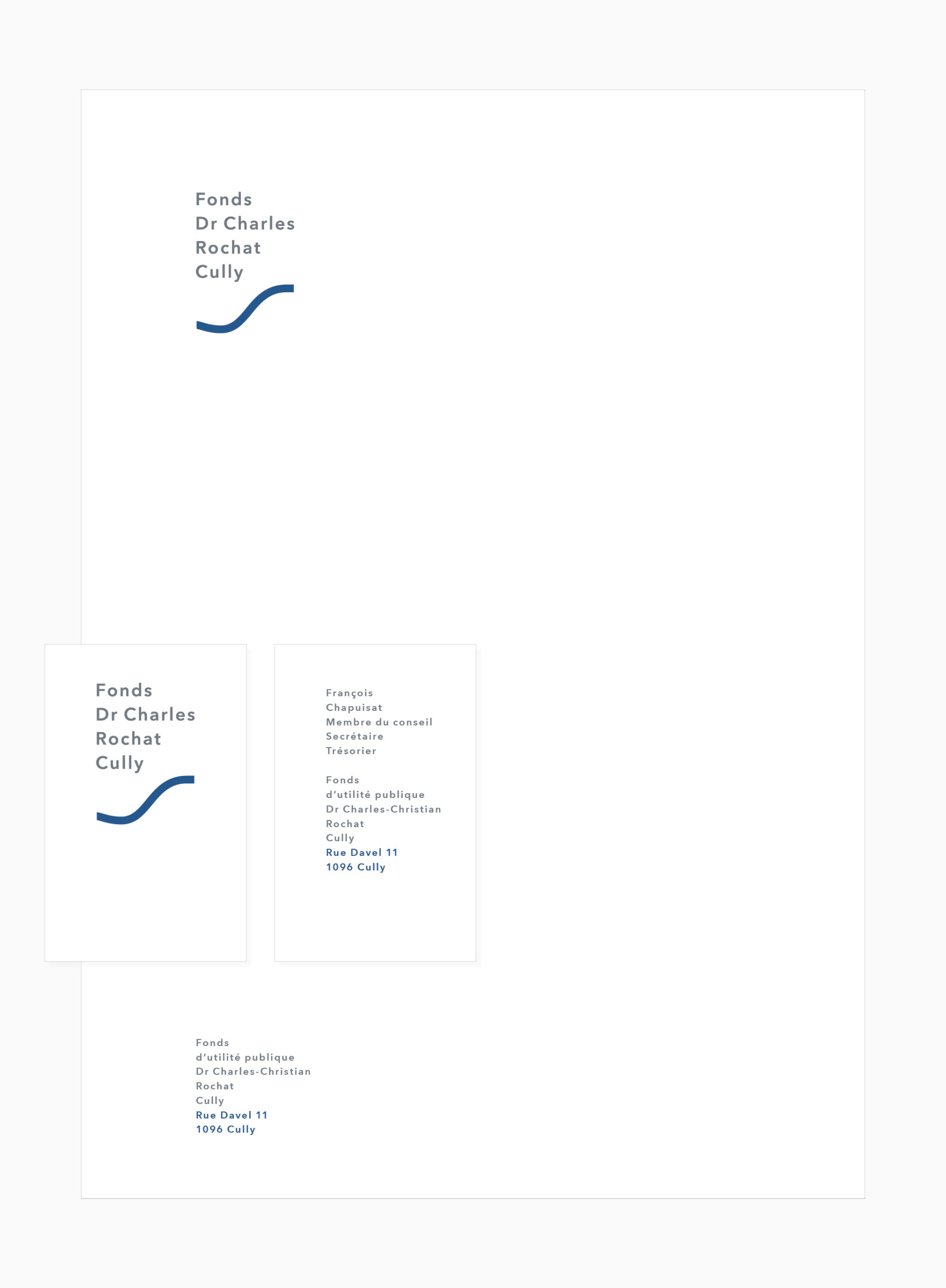 Afin de donner plus de visibilité à son action, le Conseil de fondation a décidé de se doter d’une identité visuelle et a mandaté urs schmidt design pour réaliser ce projet. La géographie du lieu et en particulier celle du rivage de Cully a été la source principale d’inspiration pour la conception du symbole du «Fonds d’utilité publique Dr Charles-Christian Rochat Cully». Ainsi, le lien de la fondation avec Cully est immédiat et sa visibilité fortement renforcée. Le symbole associé au système typographique épuré constitue cette nouvelle identité visuelle; celle-ci a convaincu l’ensemble du Conseil de fondation.