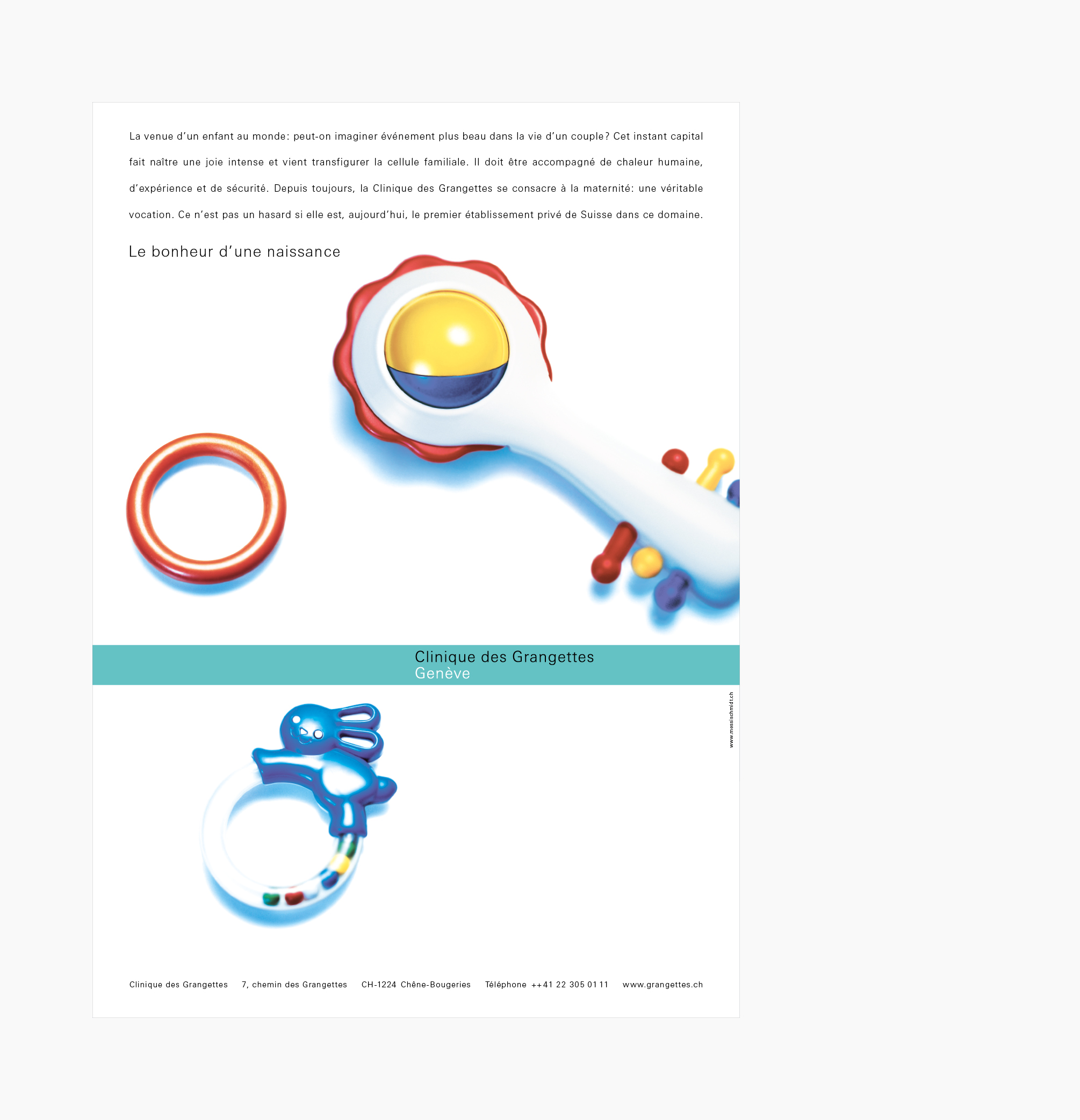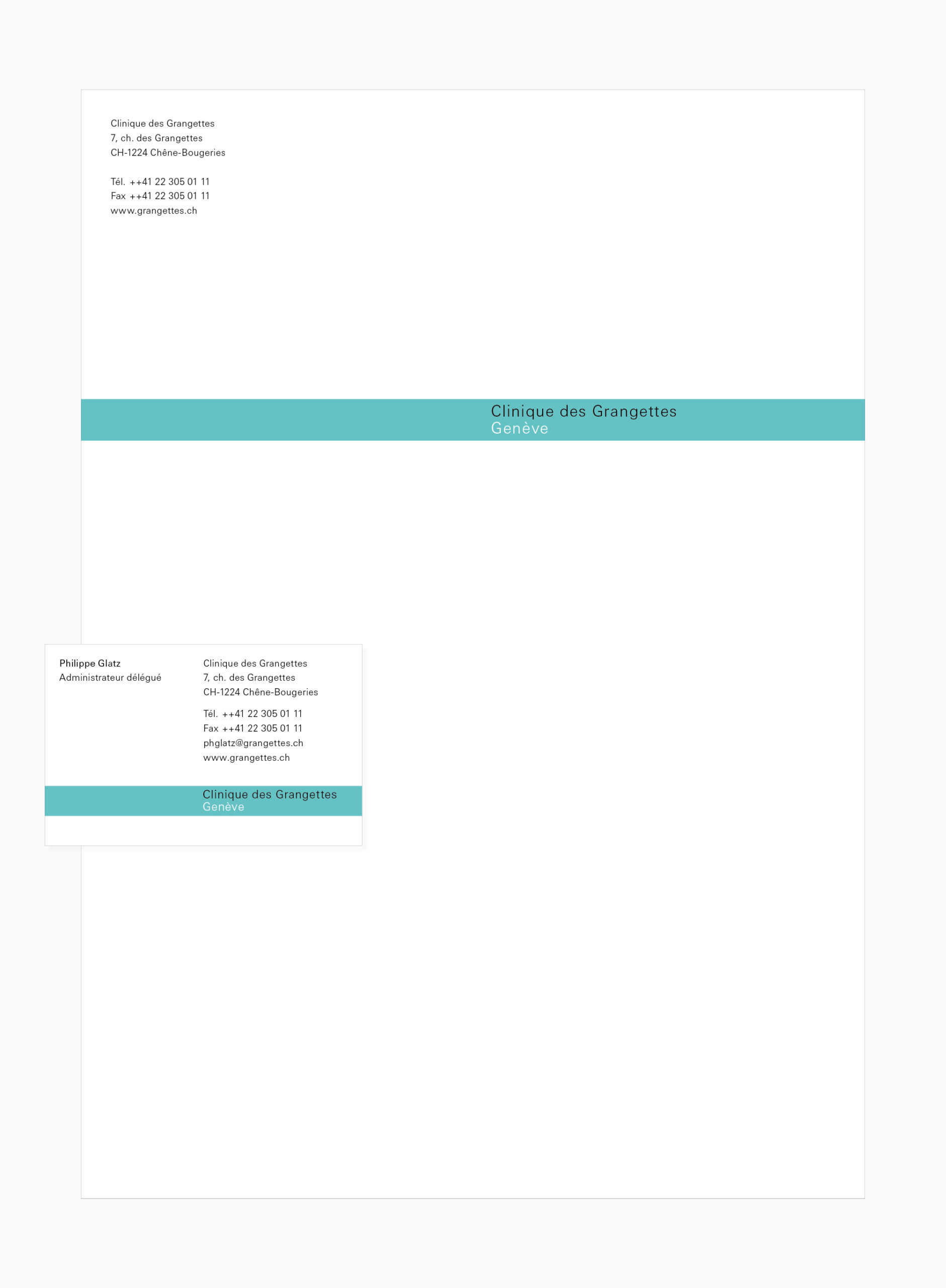 Suite à la transformation de la Clinique des Grangettes en société anonyme, une importante modernisation est entreprise. Afin de marquer cette transition, la Clinique des Grangettes s’est engagée dans le développement d’une nouvelle identité visuelle. Expression visuelle de la modernisation entreprise par la Clinique des Grangettes, la nouvelle l’identité visuelle s’intègre parfaitement au cadre de l’établissement hospitalier et sur tous ses supports de communication.